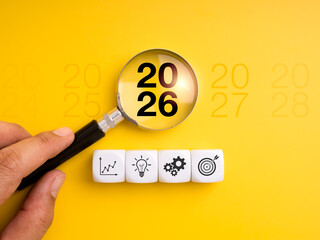 Business strategy and planning concept for 2026 with magnifying glass highlighting the year and icons of growth, ideas, settings, and goals. Perfect for forecasting trends and business development.