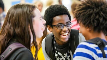 Group of diverse teenagers sharing a laugh in a vibrant school setting, showing the energy and connection of youthful friendships.