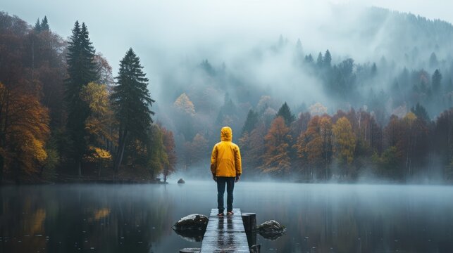 The misty mountain ambiance, a young man in a vibrant yellow jacket stands on a footbridge overlooking a serene lake.