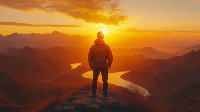 Individual gazes at the breathtaking sunset over mountains and a river in a serene landscape, capturing a moment of reflection and tranquility