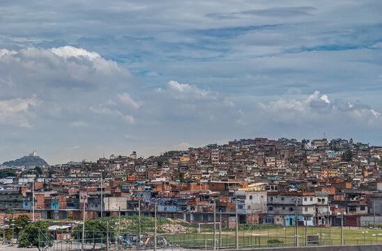 Rio de Janeiro, Brazil - December 23, 2008: Dense favella style housing on hill north side of Lagoa Rodrigo de Freita under blue cloudscape. White basilica de Penha on horizon.