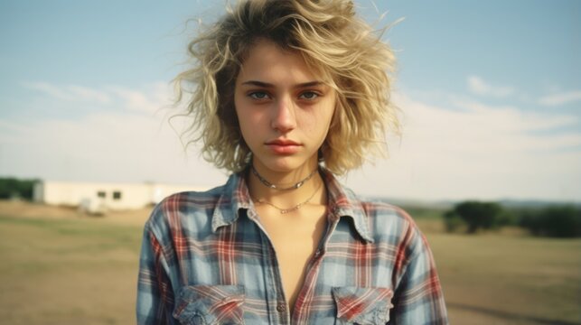 Natural youthful blonde beauty with 80's curly hairspray hairstyle, girl next door look, adorably flirty model, rural countryside flair with flannel button shirt and jeans.