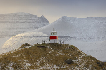 View of a red and white lighthouse perched atop a hillock against a backdrop of snow-clad mountains, a serene winter scene, Sorvagur, Vagar, Faroe Islands.