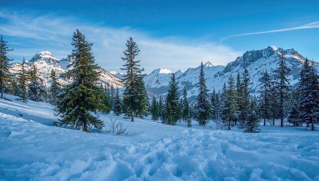 A picturesque snowy hillside adorned with dense evergreen trees and majestic frosted summits in the distance