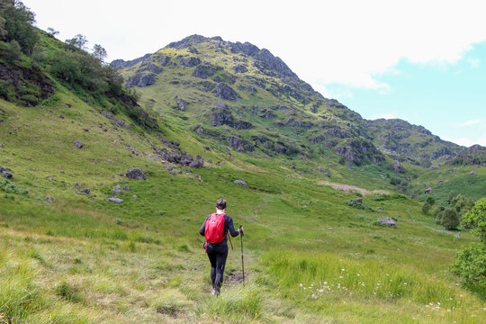 Female adventurer enjoys the breathtaking views on the way to Old Man of Storr
