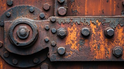 A close-up of weathered, rusty metalwork on a structure, showing intricate details of bolts and a hinge.