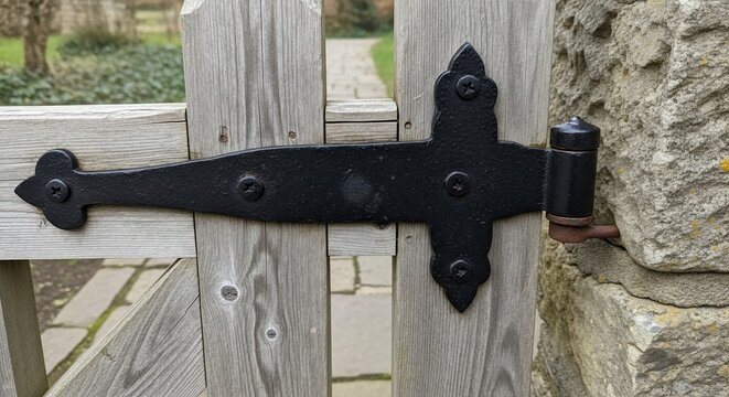 Close-up of an ornate black hinge on a weathered wooden gate with stone pillar