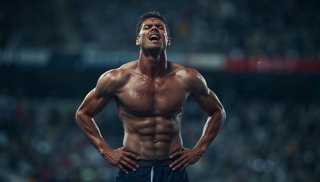 Straining shirtless male athlete standing hands on hips stadium spotlight muscular physique