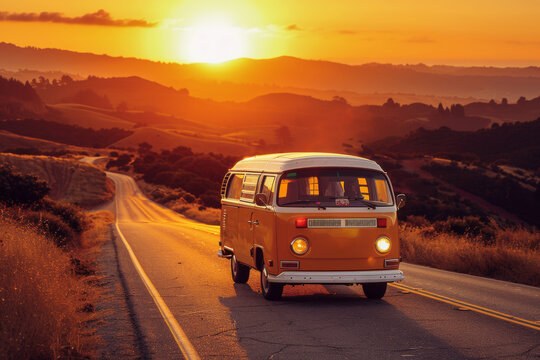 A vintage van embarks on a summer journey, blending retro style with adventure under a sunset sky.