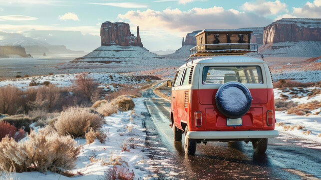 Vintage camper van driving on road in American's Wild West in winter