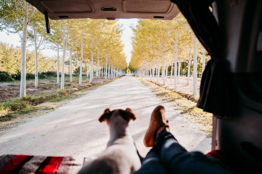 cute jack russell dog and woman legs relaxing in a van. travel concept. selective focus on trees