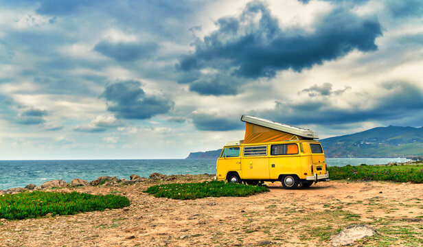 yellow camper van standing in front of the sea on a cliff with dramatic sky - travel concept.