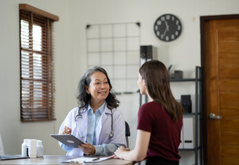 Positive senior medical professional, doctor, nurse giving support and help to young female patient at appointment.