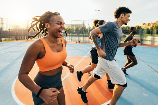 Group of friends enjoying a run on a sunny day