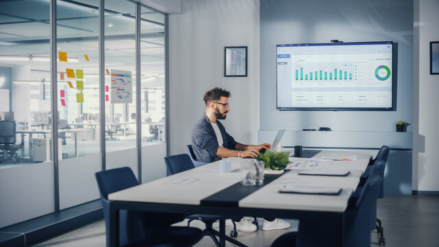 Office Conference Meeting Room: Handsome Hispanic Specialist Working on Laptop Computer with Big Wall TV with Big Data Analysis, Charts and Infographics. Businessperson Working in Growing Startup.