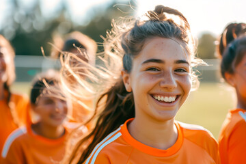 Happy confident young female football soccer player together with her teammates outdoor on the field, concept of teenager soccer training, teamwork, female player, sports