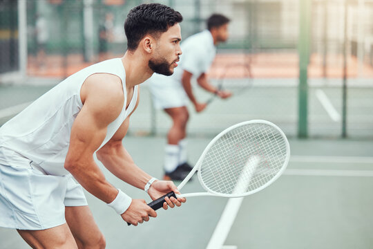 We got this. Shot of an attractive young woman standing and playing tennis with her teammate.