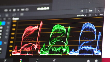 Color grading graph or RGB colour correction indicator on monitor in post production process. Telecine stage in video or film production processing. for colorist edit or adjust color on digital movie.
