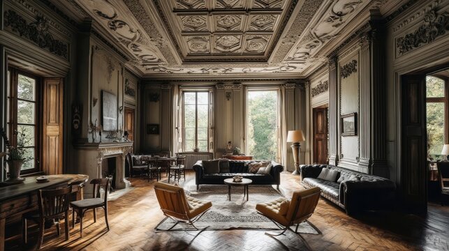 Traditional French chateau with manicured gardens, fountains, sculptures. Soft morning light. Elegant, romantic.
