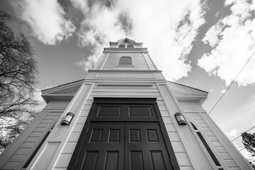 Ancient wooden church with bell tower and surrounding fence on sunny day