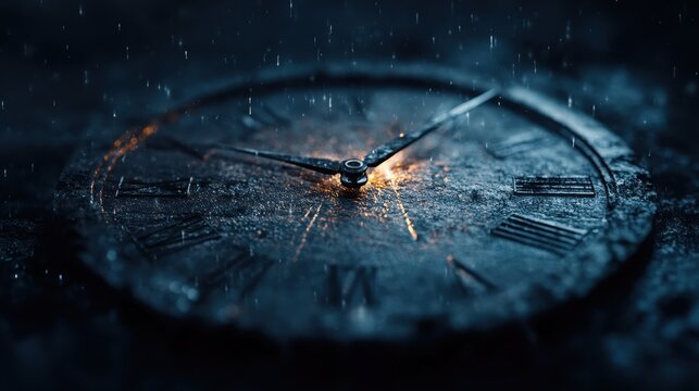 A stone clock face with weathered Roman numerals and a fiery glowing center, capturing the essence of time's passage and historical significance with a dramatic touch.