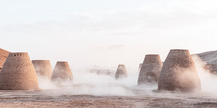 Stone structures surrounded by mist in a barren landscape during early morning hours