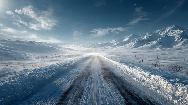 Lonely Snow-Covered Highway Stretching Through Vast hite Landscape Under Blue ky