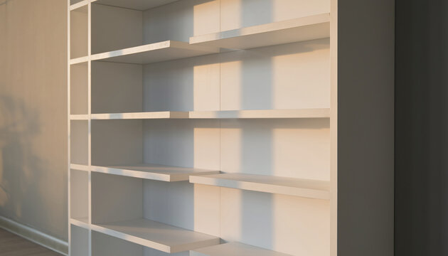 hite bookcase with several shelves is positioned in a cozy room, displaying books and small decor pieces.