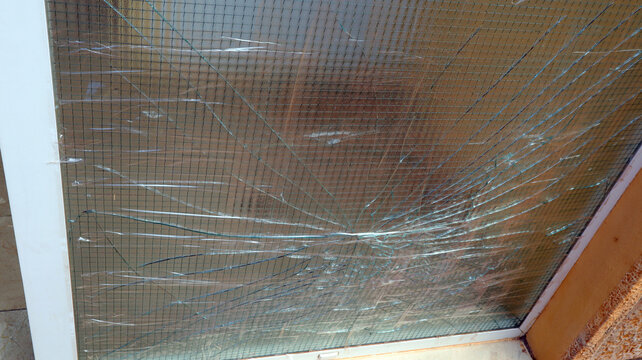 Close-up view of broken windowpane with a wire mesh behind it. Glass is shattered with numerous cracks, creating web-like pattern.W hite frame surrounding windowpane is partially visible