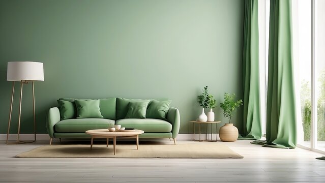 hite walls and a green-toned, empty living room. Background of home goods, interior, indoors, backdrop.-