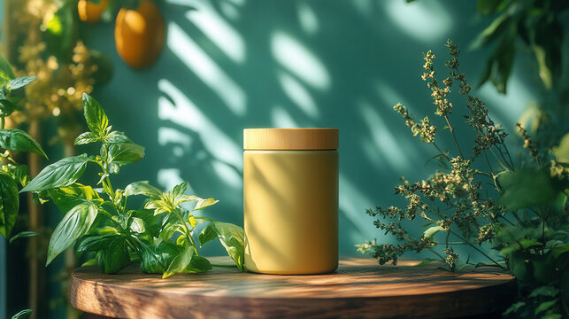 hite cylindrical protein jar mockup with herbal decor, vintage wooden table under soft diffused lighting, shadows cast gently by basil and oregano, wellness branding mood board style