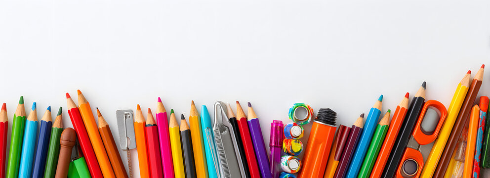 School supplies double border banner. Top view on a hite background with copy pace. Back to school concet.