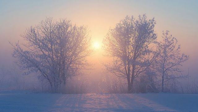 Sunrise illuminating frost-covered trees on snowy meadow, backlit misty winter morning