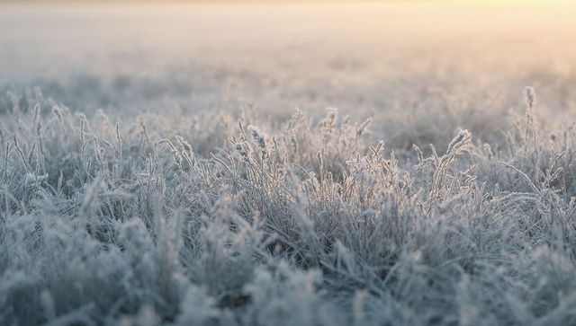 Dawn frost carpeting meadow with hoarfrost sparkling ice crystals and soft winter bokeh