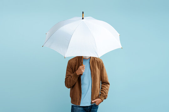 Man holding white stylish umbrella isolated on blue background