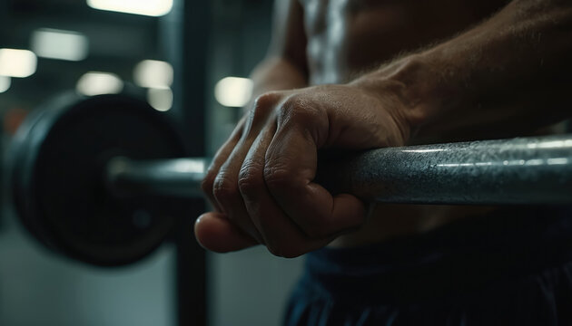Man grips barbell in gym. Close up of strong hand holding weight. Muscular bodybuilder prepares for exercise. Workout sweat glistens. Intense training session.