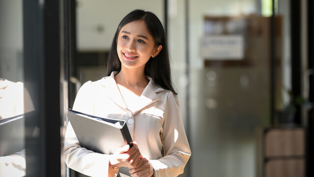 Walking businesswoman holding binder in open-plan office with data analytics overlay