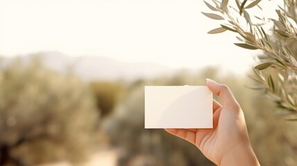 Female hand holding blank canvas frame, green plant branches on background. Wrapped white canvas for mockup poster. Spring, summer concept. Copy space. Top view.