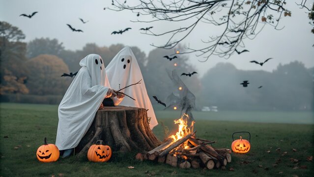 and warming themselves over a bonfire on a jack-o-lantern, two jack-olanterns behind them