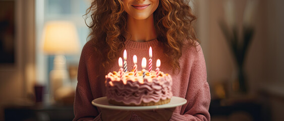 a young pretty woman is holding a birthday cake with candles in her hands.
