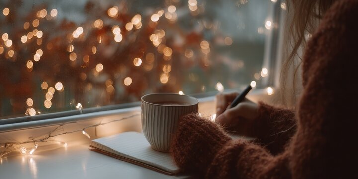A person wearing a brown sweater, holding a cup of hot cocoa, writing in a notebook by a window with fairy lights, overlooking a cityscape with autumn leaves and a blurred background.