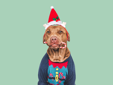 Merry Christmas and Happy New Year. Cute dog and festive costume. Space for congratulatory inscription. Closeup, studio shot. Congratulations for family, friends and colleagues. Pet care concept