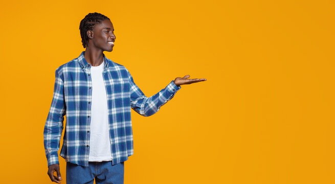Portrait of his he nice attractive cheerful cheery glad successful content brunet guy holding copy space invisible objects on palms isolated over beige color pastel background