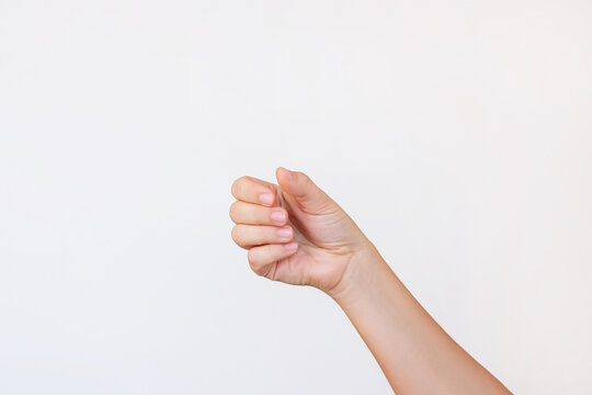 A fist-shaped female hand with clenched closed fingers making a gesture like holding something isolated on a white background. Mockup with empty copy space for a intended object
