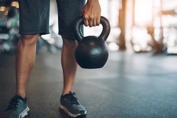 A handsome and strong Asian man in sportswear is performing a squat with a kettlebell, exercising with fitness equipment in the gym. weight training, muscular building, healthy lifestyle