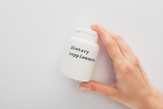 Cropped view of woman holding container with dietary supplements lettering on white background