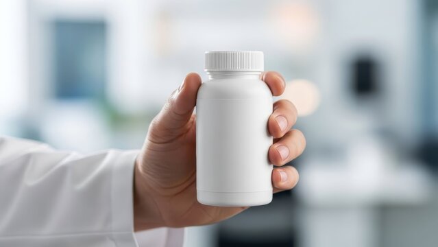 Close-up of a person holding an empty white medicine or supplement bottle with