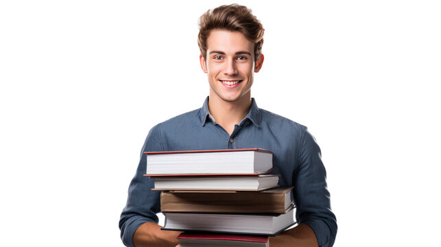 young handsome man holding notebooks, isolated on transparent and white background.PNG image.