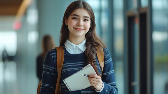 A happy young female student in a casual academic uniform, holding a pen and notebook, looking confident