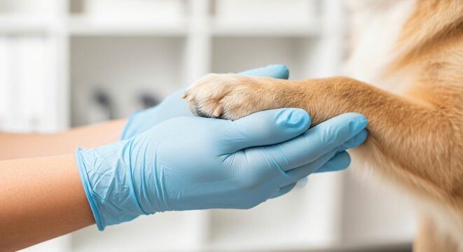 Veterinarians hand holding dogs paw Dogs paw in human